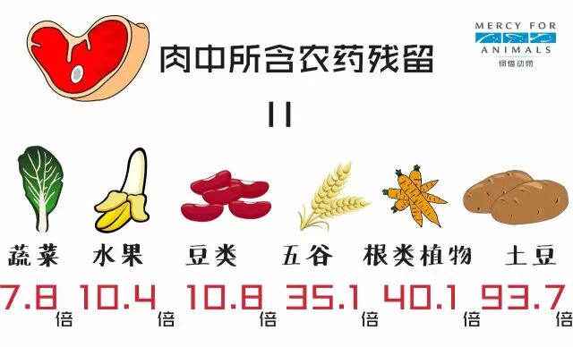 根据罗宾斯的调查,肉类里面所含的农药是绿叶蔬菜的7.8倍,水果的10.4倍,豆类的10.8倍,谷物的35.1倍,根菜类的40.1倍,土豆的93.7倍。