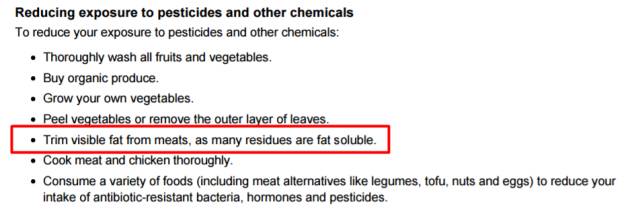 首先要和大家讲解的就是:用在养殖场动物身上的农药和激素,是脂溶性的。而这也意味着它是储藏与脂肪中的,确切的来说,动物脂肪。澳洲政府所发布的教育文档中,在教导大家如何减低食用时接触到农药以及化学物品时,也说道“尽量去除肉上面的脂肪,因为许多化学残留是脂溶性的。”